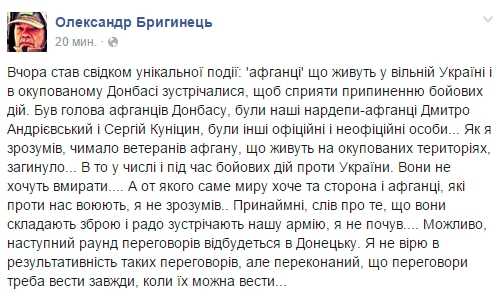 А вот какого именно мира хочет та сторона и афганцы, которые против нас воюют, я не понял.. По крайней мере, слов о том, что они складывают оружие и радушно встречают нашу армию, я не услышал.... Возможно, следующий раунд переговоров состоится в Донецке. Я не верю в результативность таких переговоров, но убежден, что переговоры надо вести всегда, когда их можно вести" - пишет Бригинец.