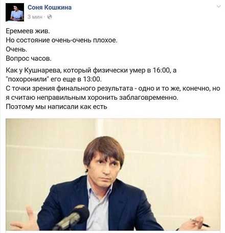 «Еремеев жив. Но состояние очень-очень плохое. Очень. Вопрос часов»,- написала шеф-редактор издания Соня Кошкина.