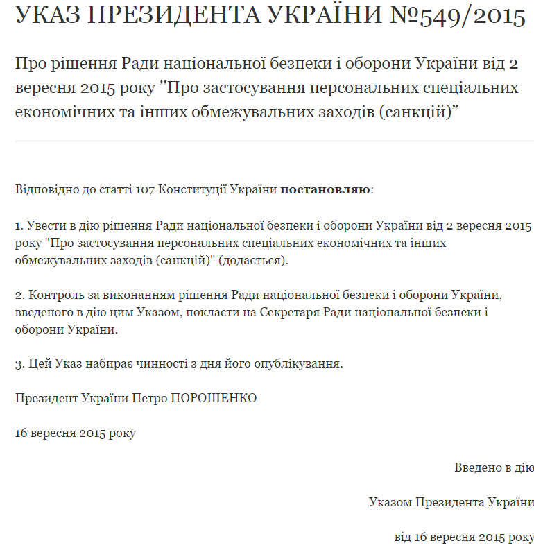 Указ Президента Украины Петра Порошенко о введении в действие решения СНБО о санкциях против России вступил в силу во вторник, 22 сентября.