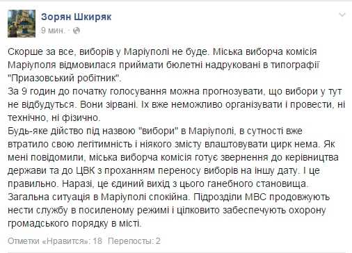 "За 9 часов до начала голосования можно прогнозировать, что выборы здесь не состоятся. Они сорваны. Их уже невозможно организовать и провести, ни технически, ни физически", - написал Шкиряк.