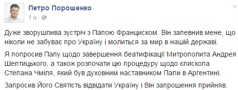 Украинский Президент добавил, что просил Папу поскорее завершить процесс беатификации Митрополита Андрея Шептицкого, и начать эту же процедуру по отношению к епископу Степану Чмилю.