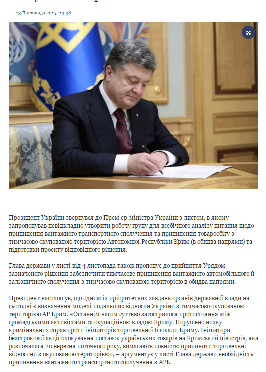 Президент Украины Петр Порошенко направил главе правительства официальное письмо с предложением экстренно создать рабочую группу для изучения возможностей прекращения грузового сообщения и приостановлении товарооборота с оккупированной территорией Крым.