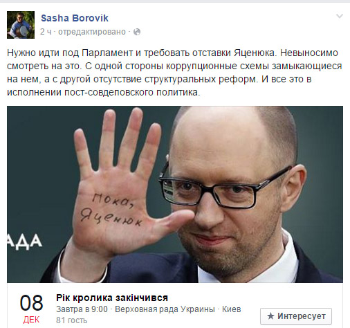 Тем времен в соцсети появилась группа, участники которой анонсировали 11 декабря в 10:00 митинг в поддержку отставки Яценюка.