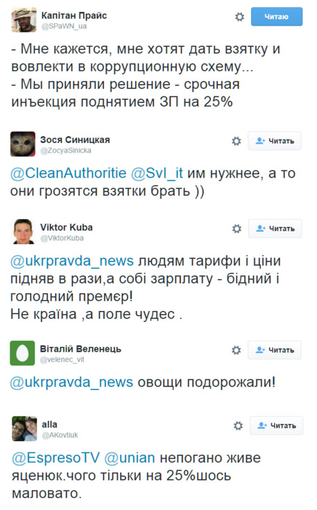 Новость о повышении на четверть оклада премьер-министра Арсения Яценюка и ряда высокопоставленных чиновников всколыхнула интернет: пользователи с ядовитой иронией смакуют доходы главы Кабмина.