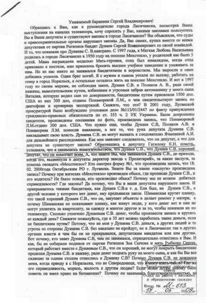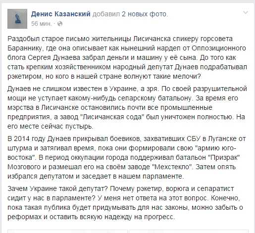 "Раздобыл старое письмо жительницы Лисичанска спикеру горсовета Бараннику, где она описывает как нынешний нардеп от Оппозиционного блога Сергея Дунаева забрал деньги и машину у её сына. До того как стать крепким хозяйственником народный депутат Дунаев подрабатывал рэкетиром, но кого в нашей стране волнуют такие мелочи?", - пишет журналист.