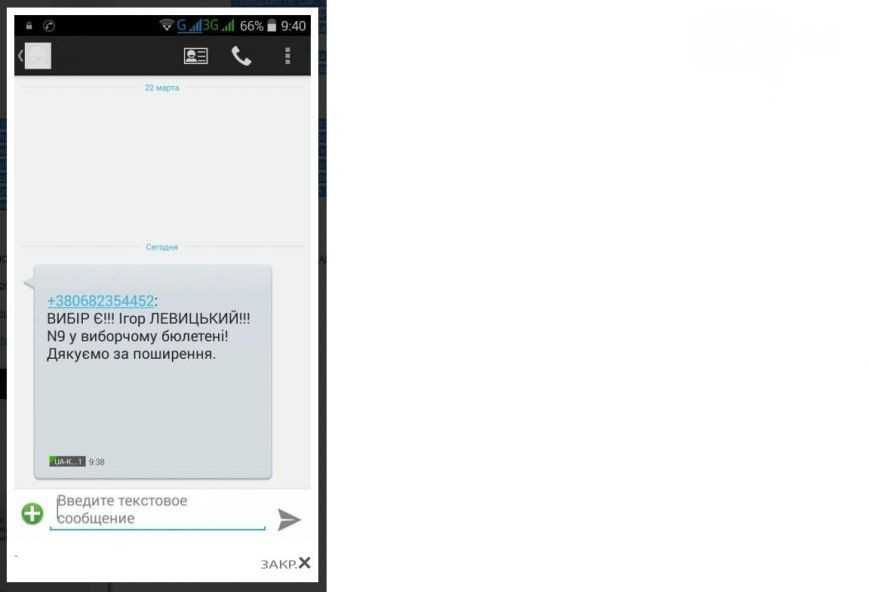 Сообщается, что SMS- сообщения поступают с номера 0682354452 якобы от кандидата Игоря Левицкого с текстом сообщения: "ВЫБОР Есть !!! Игорь Левицкий !!! №9 в избирательном бюллетене! Спасибо за распространение", а также от отправителя GOLOSUY с текстом "Голосуй за мир и стабильность! Выберем мэра в первом туре!". Это сообщение без призыва голосовать за определенного кандидата, но использует слоганы из агитационных материалов Юрия Вилкула.