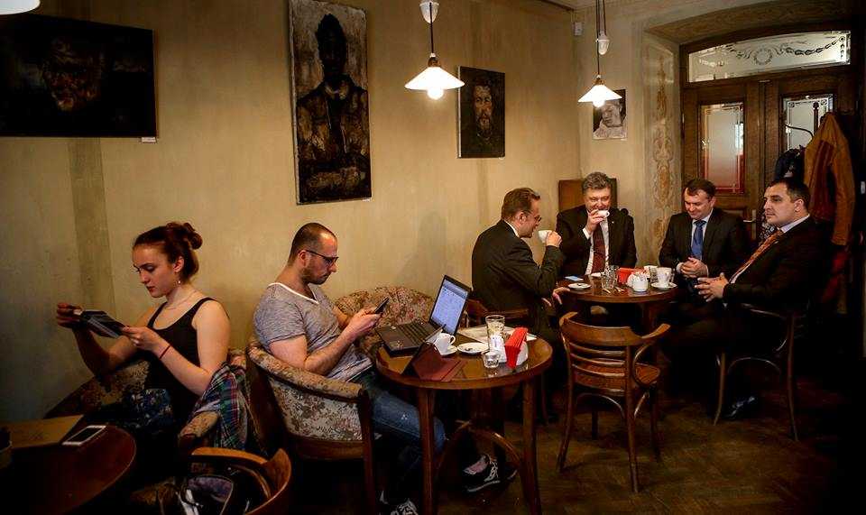 На странице Президента Украины Петра Порошенко в Фейсбуке опубликовано фото, на котором глава государства пьет кофе с мэром Львова Андреем Садовым в одном из львовских кафе.