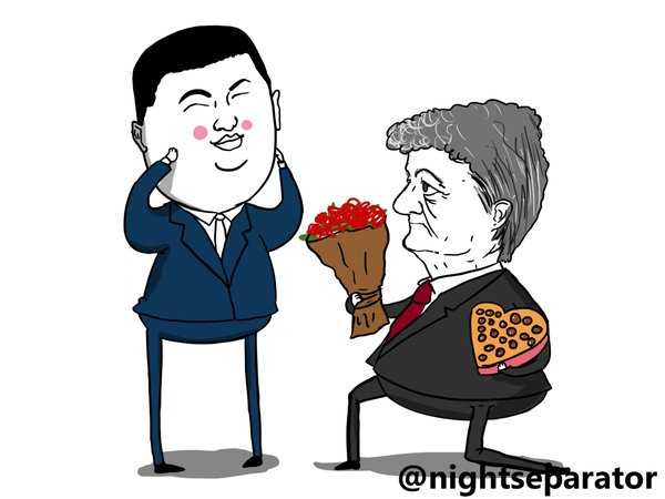 На ней украинский президент стоит на одном колене перед Гройсманом, держа в одной руке букет цветов, а в другой — коробку конфет в форме сердца.
