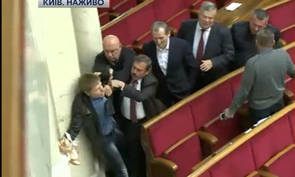 Нардепы Василий Нимченко, Юрий Мороко, Иван Мирный, а также депутат от группы "Видродження" Антон Киссе не дали Гончаренко пройти к месту Скорика, началась потасовка.