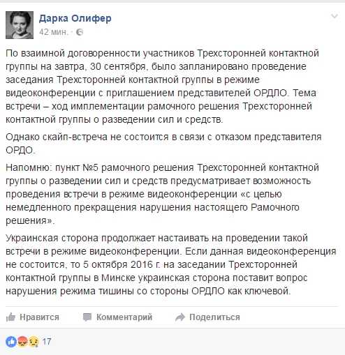 Украинская сторона продолжает настаивать на проведении такой встречи в режиме видеоконференции. Если данная видеоконференция не состоится, то 5 октября 2016 г. на заседании Трехсторонней контактной группы в Минске украинская сторона поставит вопрос нарушения режима тишины со стороны ОРДЛО как ключевой" - написала Олифер.