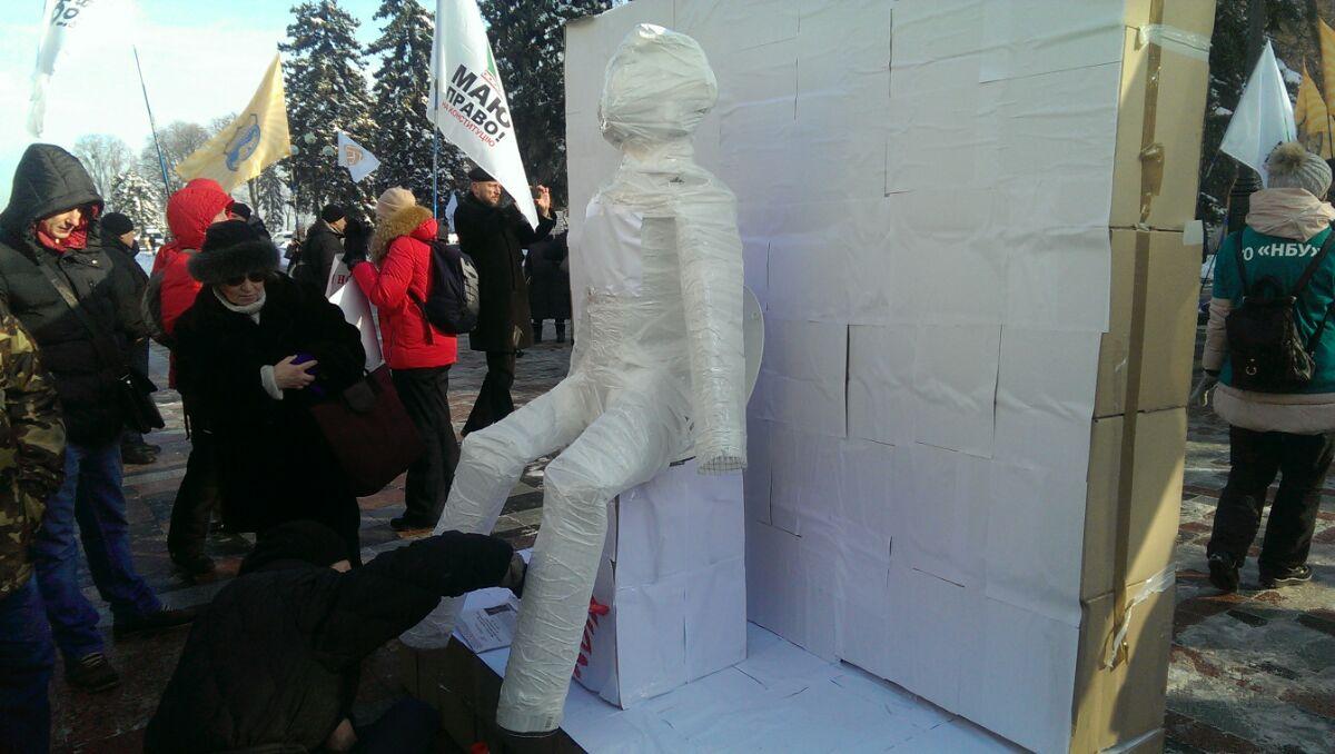 В центре Киева продолжаются акции протеста. Несколько тысяч участников акции собрались возле Нацбанка и Верховной Рады. Под стены Рады принесли чучело, которое посадили на импровизированный "унитаз", символизирующий Конституцию.