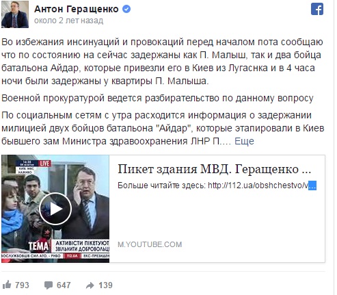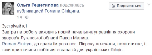 Активистка Ольга Решетилова на своей станице в Facebook первой опубликовала новость о назначении Малыша.