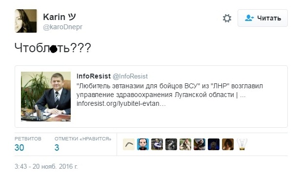 "И до с***и им все, подождали, пересидели и вот он, любитель эвтаназии для украинских бойцов. Получил опять назначение", - написала возмущенно Решетилова.