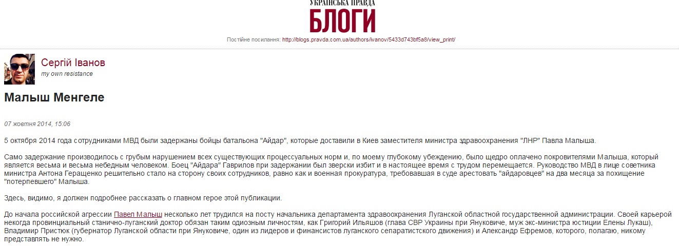 В тоже время известный блогер Сергей Иванов в своей колонке на "УП" припомнил инициативу Малыша о том, что тот в конце августа 2014 года, хотел создать бригаду эвтаназов, чтобы усыплять раненных украинских бойцов и патриотов.