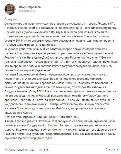 А ведь я заочно уважал Наталью Поклонскую за ее принципиальную позицию и стойкую защиту Государя и Его Семьи... Теперь это уважение рассеялось, как морок... " - написал Стрелков.