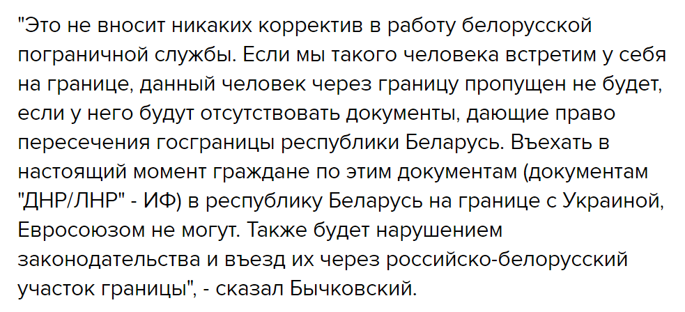 Он отметил, что решение России никак не повлияет на отношения белорусской стороны - человек с "паспортом" "ДНР" не сможет попасть в страну, так как указанные выше "документы" не дают права пересечения белорусской границы. Въезд указанных лиц с территории России в Беларусь также находится под запретом и станет нарушением закона.