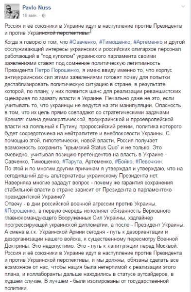 "Когда я говорю о том, что #Савченко, #Тимошенко, #Артеменко и другой обслуживающий интересы украинских и российских олигархов персонал работающий "под куполом" украинского парламента своими заявлениями ставят под сомнение политическую легитимность Президента Петра Порошенко, я имею ввиду именно то, что корпус антиукраинских сил этими заявлениями готовят почву для попытки дестаблизировать политическую ситуацию в стране, в результате которой, по плану, у них появится шанс для реализации реваншистских сценариев по захвату власти в Украине. Печально даже не это, если учитывать то, что украинцы не ведутся на эти манипуляции. Опасность в том, что их цель прямо совпадает со стратегическими задачами Кремля: смена демократической, проукраинской и проевропейской власти на лояльный к Путину, пророссийский режим, политика которого будет сосредоточена на нейтралитете и внеблоковости Украины. С помощью этой, гипотетически, новой власти, Россия получает возможность сохранить "крымский Status Quo" и не только. Это очевидно, учитывая позицию претендентов на власть в Украине - Савченко, Тимошенко, #Тарута, Артеменко, #Бойко, #Левочкин" - пишет политолог.