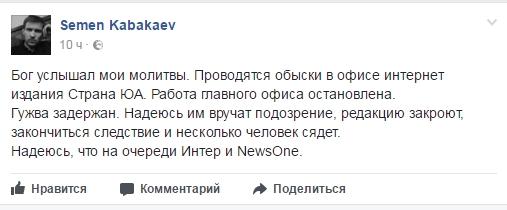 Прокомментировал ситуацию с обыском и задержанием Гужвы координатор группы «Стоп Террор» Семен Кабакаев. Он надеется, что «редакцию закроют и несколько человек сядут в тюрьму. По его мнению, следующими должны быть Интер и NewsOne.