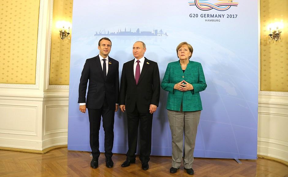 Во второй день работы саммита «Большой двадцатки» лидеры Германии, России и Франции провели трехстороннюю встречу. Президент РФ Владимир Путин встретился за рабочим завтраком с Федеральным канцлером Германии Ангелой Меркель и Президентом Франции Эммануэлем Макроном.