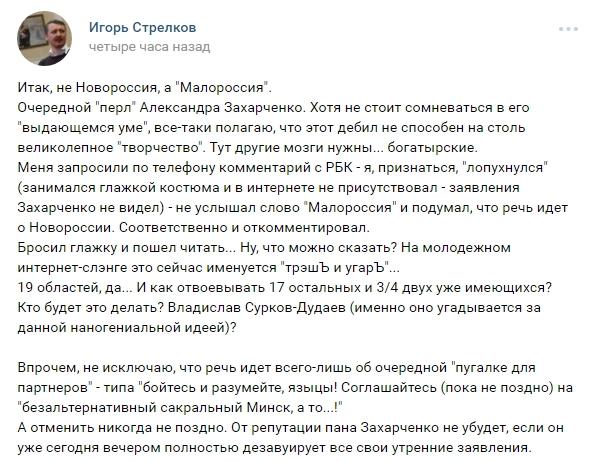 "Итак, не Новороссия, а "Малороссия". Очередной "перл" Александра Захарченко. Хотя не стоит сомневаться в его "выдающемся уме", все-таки полагаю, что этот дебил не способен на столь великолепное "творчество". Тут другие мозги нужны... богатырские", - отметил Гиркин.