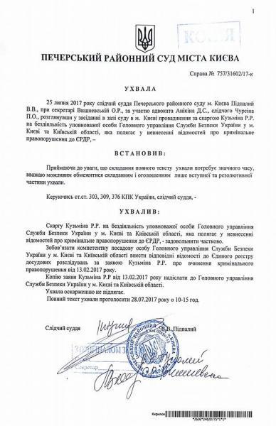 Кузьмин обнародовал скан-копию решения Печерского райсуда и официального ответа СБУ на его заявление.