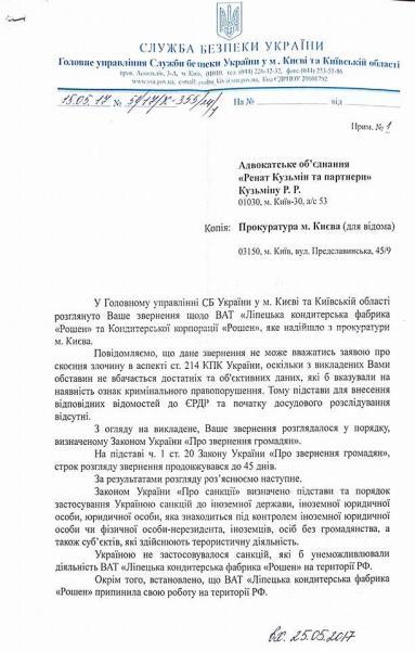 В СБУ сначала отказались давать ход заявлению Кузьмина по причине отсутствия санкций, которые запрещали бы деятельность фабрики на территории РФ. Экс-прокурору пригрозили ответственностью за клевету на президента и подчеркнули, что прошли те времена, когда госаппарат, правоохранительные органы и прокуратуры могли использоваться для расправы над политическими деятелями.