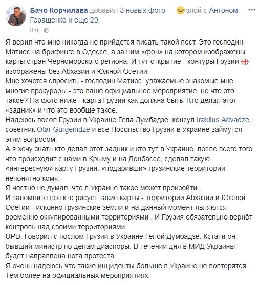 Грузия направила ноту протеста Министерству иностранных дел Украины из-за «урезанной» территории страны. Во время брифинга военного прокурора Анатолия Матиоса за его спиной находилось изображение карты Грузии без территории Абхазии и Южной Осетии. Данный факт не на шутку разозлил бывшего пресс-атташе посольства Грузии в Украине Бачо Корчилаву. На своей странице в Фейсбуке он оставил гневный пост.