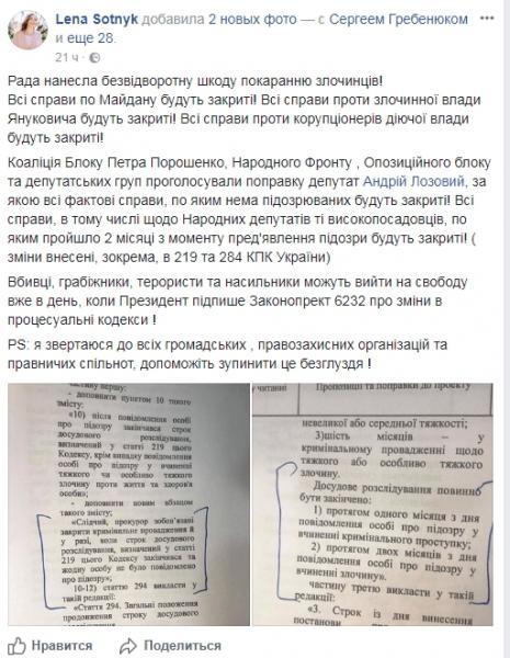 "Все дела, в том числе по народным депутатам и чиновникам, по истечении 2 месяцев с момента предъявления подозрения будут закрыты", - написала Елена Сотник в Фейсбуке, добавив, что это сделает невозможным привлечение к ответственности нынешних коррупционеров и чиновников времен президентства беглого Виктора Януковича.