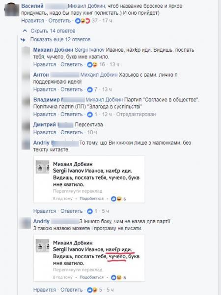 Среди комментаторов нашлись и те, кто поддерживает Михаила Добкина. Они предлагают ему готовые концепции и варианты названий для политсилы. В их числе: «Последний герой», «Нескучные лица», «Достало», «Украина без рогулей», «Самообновление», «Вернем утерянное, создадим новое», Партия Докер(Добкин+Кернес).
