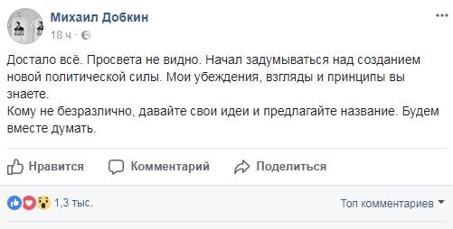 «Достало все. Просвета не видно. Начал задумываться над созданием новой политической силы. Мои убеждения, взгляды и принципы вы знаете. Кому не безразлично, давайте свои идеи и предлагайте название. Будем вместе думать», - написал он.