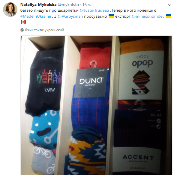 "Много пишут о носках Джастина Трюдо. Теперь в его коллекции есть Made In Ukraine. С Владимиром Гройсманом продвигаем украинский экспорт", - говорится в сообщении.