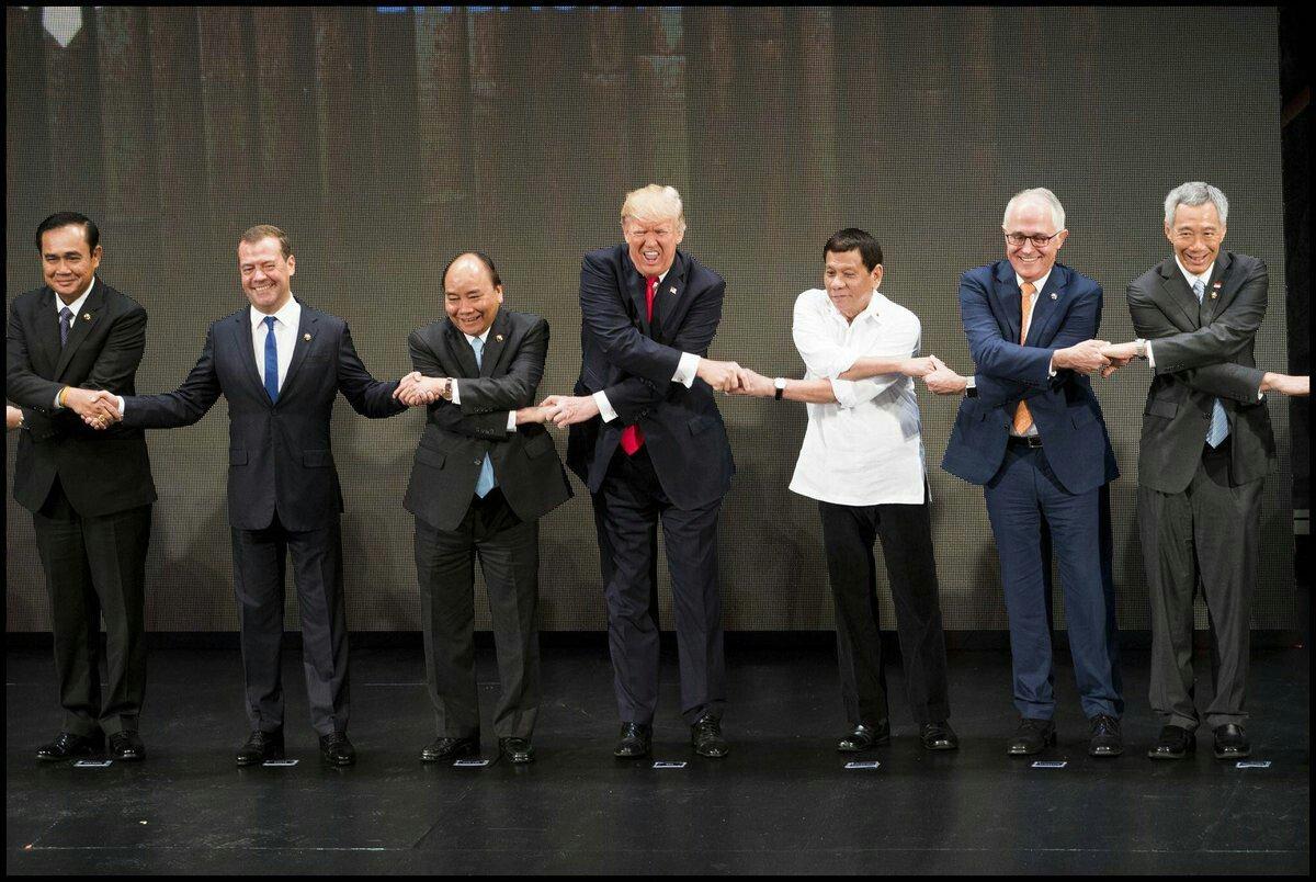 Сейчас в Маниле проходит саммит Ассоциации государств Юго-Восточной Азии (АСЕАН). На церемонии открытия этого мероприятия обычно делается групповое фото, на котором лидеры государств-участников пожимают друг другу руки, скрестив их.