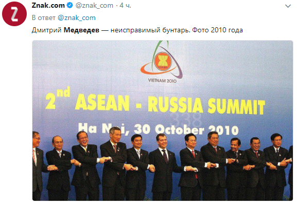 Гармонию кадра нарушил Медведев, не поняв, что именно нужно делать с руками. Причем сделал он это уже не в первый раз: издание "Медуза" напомнило, что в 2010 году на саммите АСЕАН-Россия Медведев, будучи на тот момент президентом РФ, также "запутался" в своих руках.