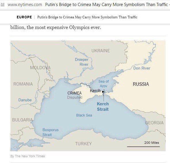 На днях авторитетное американское издание New York Times спровоцировало скандал изображением, которым сопровождался материал о строящемся Керченском мосте: аннексированный украинский полуостров на карте значится как «спорная территория» и закрашен таким же оттенком, как РФ.