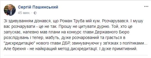 "С удивлением узнал, что Роман Труба мой кум. Разочаровался. И должен вас разочаровать - это не так. Прошу не цитировать "дурню". Тот, кто это запускает, наверное имел планы на конкурс главы Государственного Бюро расследований и теперь, видимо, очень разочарован и играет в "дискредитацию" нового главы ГБР, обвиняя в связях с политиками", - написал Пашинский в соцсети.