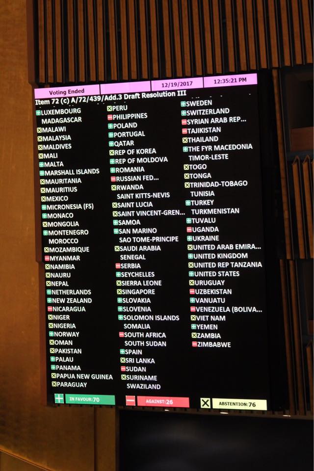 Против резолюции проголосовали Армения, Венесуэла, Беларусь, Боливия, Бурунди, Камбоджа, Китай, Куба, Северная Корея, Эритрея, Индия, Иран, Казахстан, Кыргызстан, Мьянма, Никарагуа, Филиппины, Россия, Сербия, Южная Африка, Судан, Сирия Таджикистан, Уганда, Узбекистан и Зимбабве.