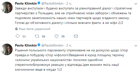 Глава украинского МИД Павел Климкин заявил, что «антибандеровский» закон вместо исторической правды выстраивает историческую мифологию. Министр также сообщил о готовности Украины к диалогу и изучению сообща фактов, но не мифов.