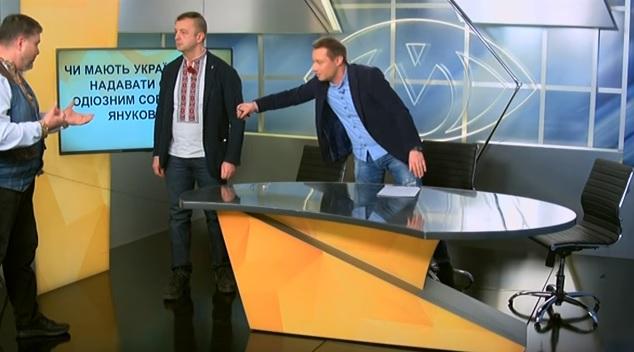 Темой программы был вопрос о том, нужно ли приглашать на эфиры сторонников бывшего президента Украины Виктора Януковича. «Свободовец» заявил, что всяким «портновым» и «германам» нет места на украинском телевидении, так как люди, которые не за Украину – ее враги.