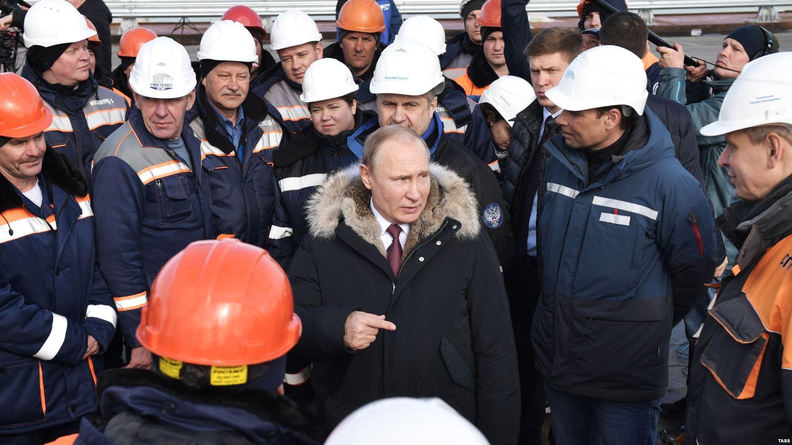 Свой визит в Крым Путин начал с посещения Керченского моста. Он решил лично посмотреть, как идет строительство и пообщаться с рабочими.