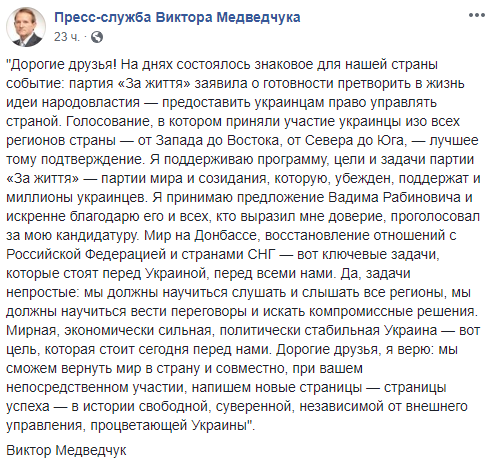 По словам депутата, Медведчук как представитель его партии возглавит направление по "восстановлению мира" с Россией. По словам Рабиновича, 25 июля во время представления его партии телезрители голосовали за тех людей, которым можно доверить то или иное направление. В результате Медведчуку отдали предпочтение как лучшей кандидатуре по восстановлению отношений с РФ и СНГ.
