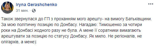 "Подготовила на спикера ВР Парубия требование на первом же заседании ВР снять с меня по требованию члена Батькивщины, некоего Сенченко, депутатскую неприкосновенность. Он, бывший заместитель главы АП в 2014, который в драматические дни 2014 ни дня не был в Крыму, и вместе с Тимошенко за эти 4 года ни разу не был на Донбассе (где я была 80 раз, друзья, под обстрелами и российскими Градами) требует снять с меня неприкосновенность и судить. За мою позицию по Донбассу. Это прекрасно. Я отстаиваю усиление наших переговорных позиций и пролонгации санкций против РФ. Батькивщина же, Тимошенко, которая не голосовала за РФ как страну агрессора и ее дворовые собачки, против этого. Я - за снятие неприкосновенности и суд! Буду требовать голосования за снятие неприкосновенности в первый день работы ВР. И пусть попробуют не снять и не подать в суд!" - написала Геращенко в Фейсбуке.