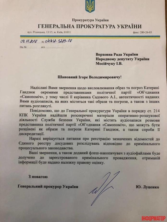 Генпрокуратура в ответ на обращение нардепа Игоря Мосийчука заявила, что решается вопрос о регистрации полученных сведений в ЕРДР.