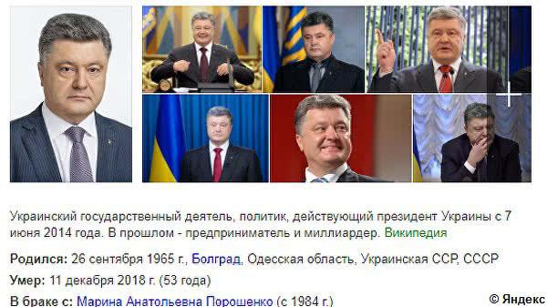Российский поисковый сервис Яндекс начал выдавать по запросу "Порошенко" "дату смерти" украинского президента.