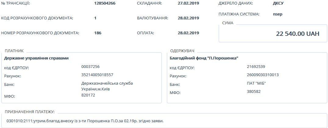 Эта сумма была перечислена в "Благотворительный фонд Порошенко", о чем указано на портале использования публичных средств.