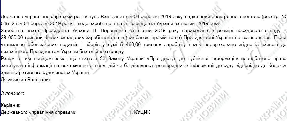 Сообщается, что за февраль 2019 года Петру Порошенко было начислено 28 000 гривен в соответствии с должностным окладом. Никаких надбавок и премий установлено не было.