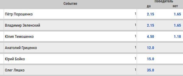 Что касается третьего места президентской гонки, то на него с большим отставанием от первой пары опустилась Тимошенко. Коэффициент на ее победу - 4.5.