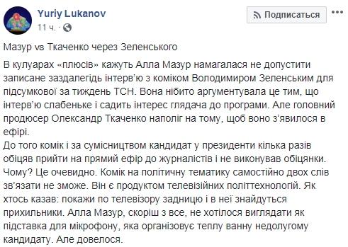 До этого комик и по совместительству кандидат в президенты несколько раз обещал прийти на прямой эфир к журналистам и не выполнял обещания. Почему? Это очевидно. Комик на политическую тематику самостоятельно двух слов связать не сможет. Он является продуктом телевизионных политтехнологий. Как кто-то говорил: покажи по телевизору задницу и у нее найдутся поклонники. Алла Мазур, скорее всего, не хотелось выглядеть как подставка для микрофона, которая организовывает теплую ванну бестолковом кандидату. Но пришлось", - написал Луканов.
