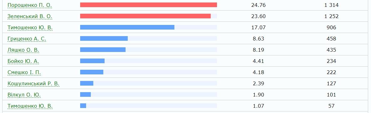 По первым данным итоги таковы: Порошенко — 24.76% голосов, Зеленский — 23.60%, Тимошенко — 17.07%.
