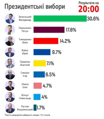 Согласно окончательным результатам экзит-поллов по состоянию на 20:00 31 марта, Владимир Зеленский набирает наибольшее количество голосов избирателей.
