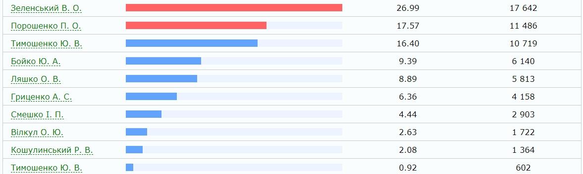 По результатам обработки 1,10% всех бюллетеней, Зеленский набрал 26.99%. Его ближайший конкурент Петр Порошенко - 17.57%. С минимальным отрывом от Порошенко на 3 месте находится Юлия Тимошенко - 16.40%.